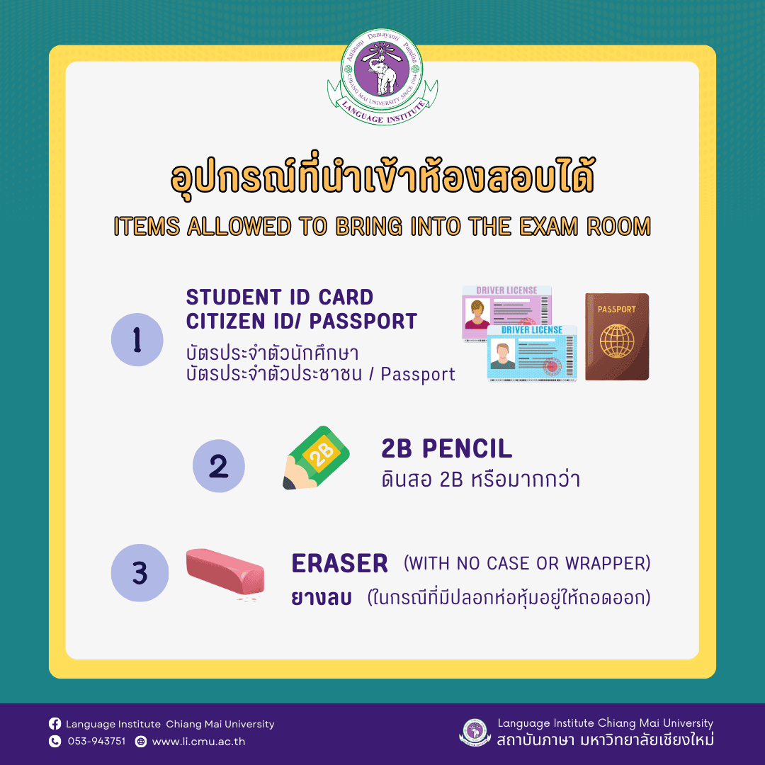 - เตรียมบัตรนักเรียนนักศึกษา หรือบัตรประจำตัวประชาชนเพื่อแสดงต่อผู้คุมสอบ