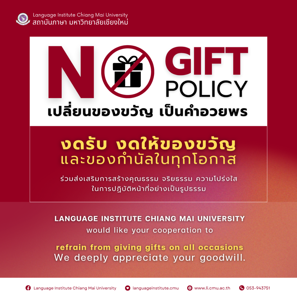 The Language Institute of Chiang Mai University has announced a "No Gift Policy," encouraging the practice of exchanging well-wishes instead of gifts on all occasions. This initiative aims to promote ethical behavior, transparency, and integrity in the execution of professional duties in a clear and concrete manner.