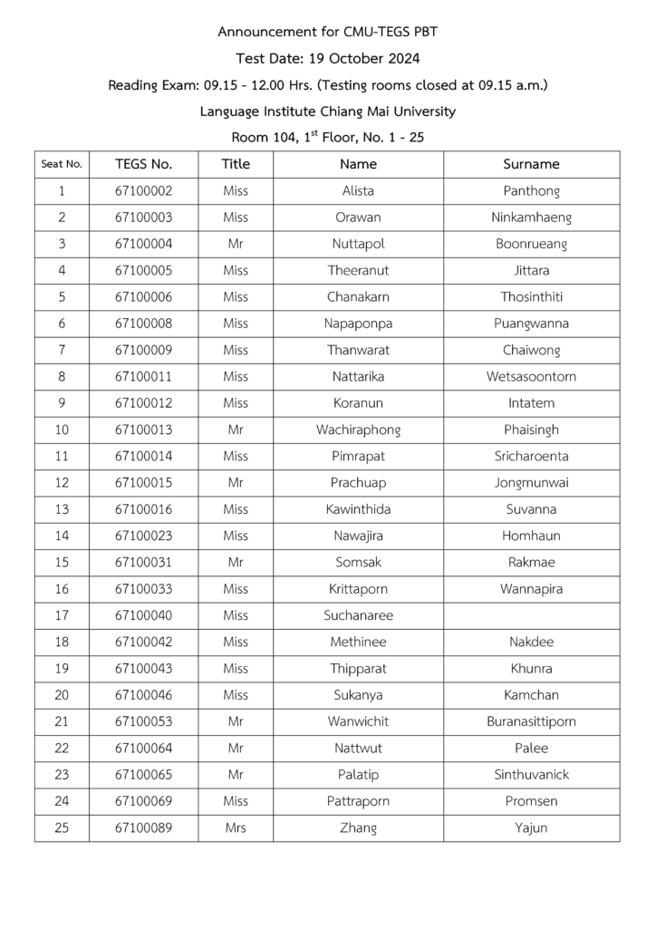 🔴 ลำดับ 1 – 25 ชั้น 1 ห้อง 104 อาคารสถาบันภาษา มหาวิทยาลัยเชียงใหม่ 🔴