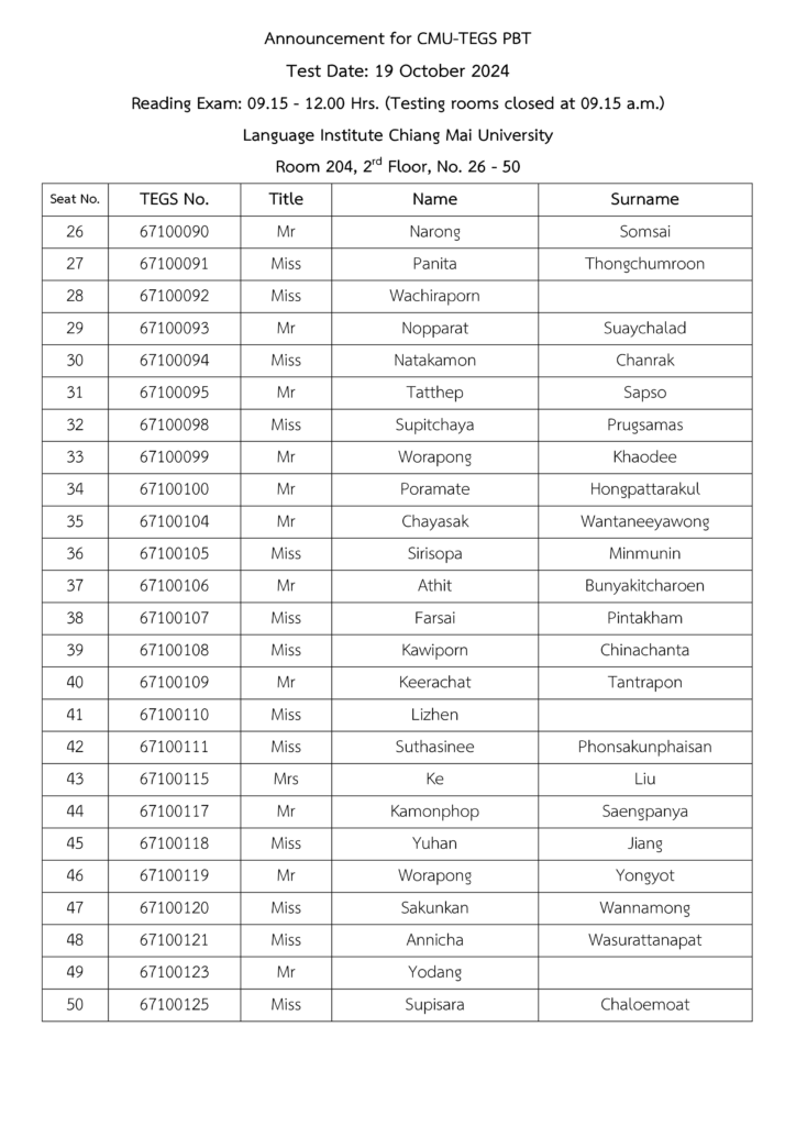 🔴 ลำดับ 26 – 50 ชั้น 2 ห้อง 204 อาคารสถาบันภาษา มหาวิทยาลัยเชียงใหม่ 🔴