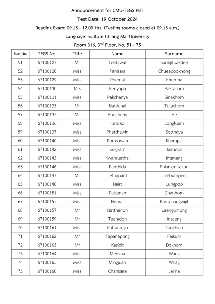 🔴 ลำดับ 51 – 75 ชั้น 3 ห้อง 316 อาคารสถาบันภาษา มหาวิทยาลัยเชียงใหม่ 🔴