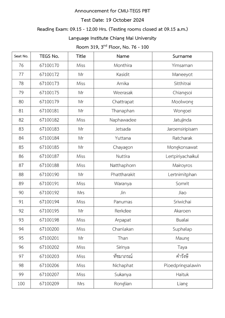 🔴 ลำดับ 76 – 100 ชั้น 3 ห้อง 319 อาคารสถาบันภาษา มหาวิทยาลัยเชียงใหม่ 🔴