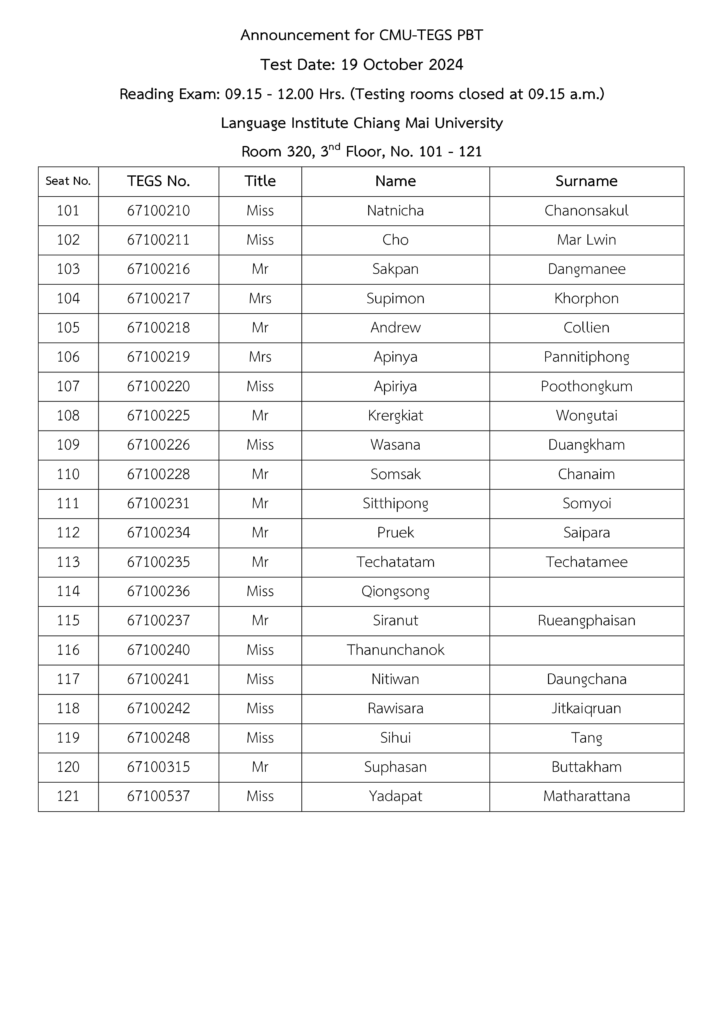 🔴 ลำดับ 101 – 121 ชั้น 3 ห้อง 320 อาคารสถาบันภาษา มหาวิทยาลัยเชียงใหม่ 🔴