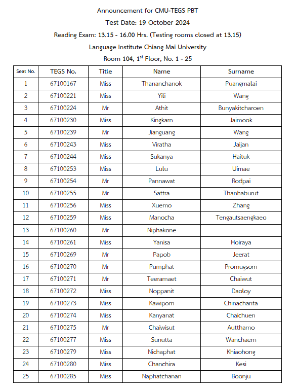 🔴 ลำดับ       1 – 25    ชั้น 1   ห้อง 104   อาคารสถาบันภาษา มหาวิทยาลัยเชียงใหม่ 🔴