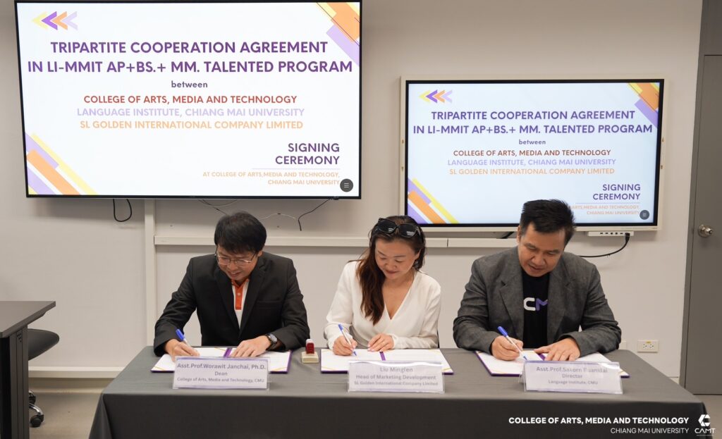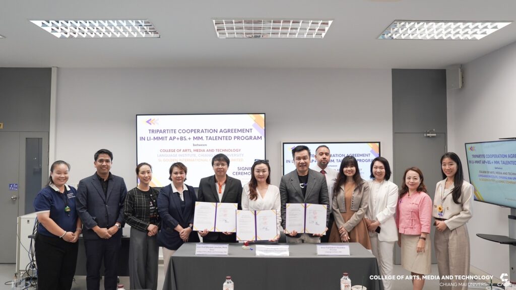 On September 24, 2025, the Language Institute, Chiang Mai University, together with the College of Art, Media and Technology, Major in Moderm Modern Management and Information Technology (MMIT), Chiang Mai University and SL Golden International Company Limited, signed a Memorandum of Understanding (MoU) to co-develop the international program “LI–MMIT AP+BS+MM. Talented Program” at the College of Arts, Media and Technology, Chiang Mai University.
